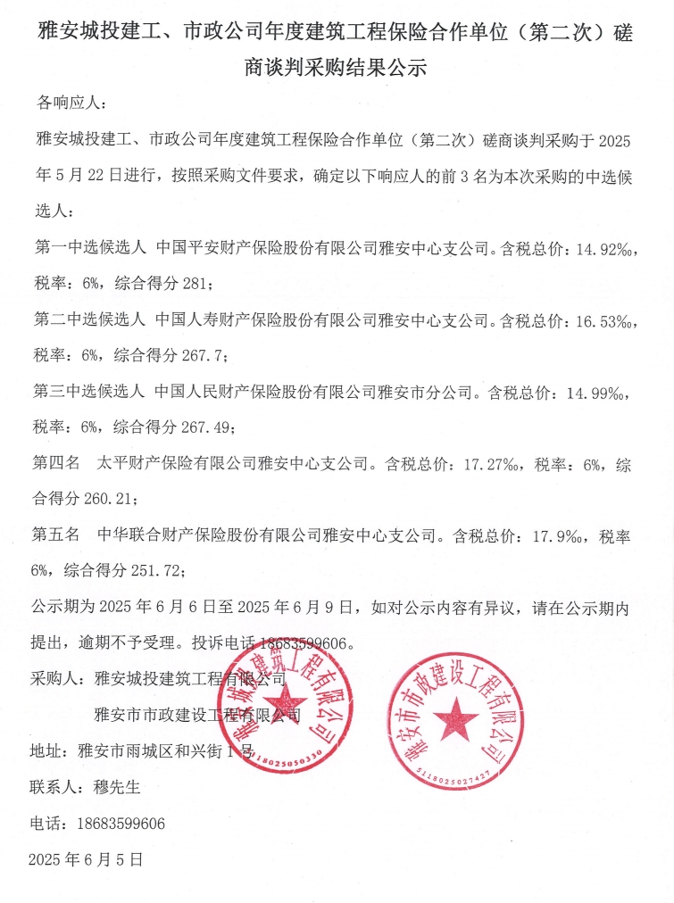 雅安城投建工、市政公司年度建筑工程保險(xiǎn)合作單位(第二次)磋商談判采購結(jié)果公示