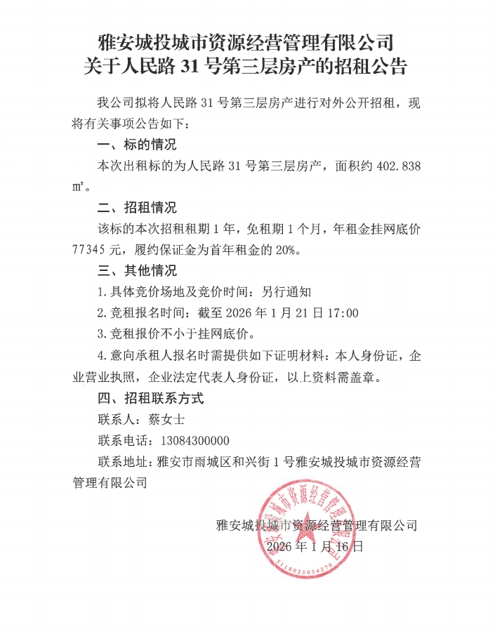 雅安城投城市資源經(jīng)營管理有限公司關(guān)于人民路31號第三層房產(chǎn)的招租公告