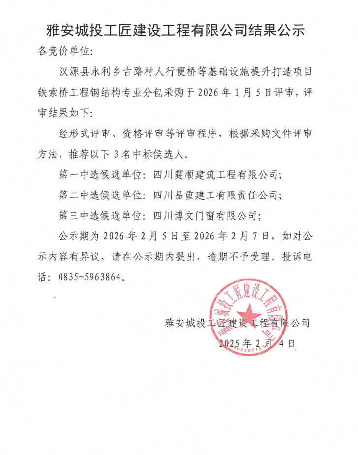 漢源縣永利鄉(xiāng)古路村人行便橋等基礎(chǔ)設(shè)施提升打造項(xiàng)目鐵索橋工程鋼結(jié)構(gòu)專業(yè)分包采購(gòu)結(jié)果公示