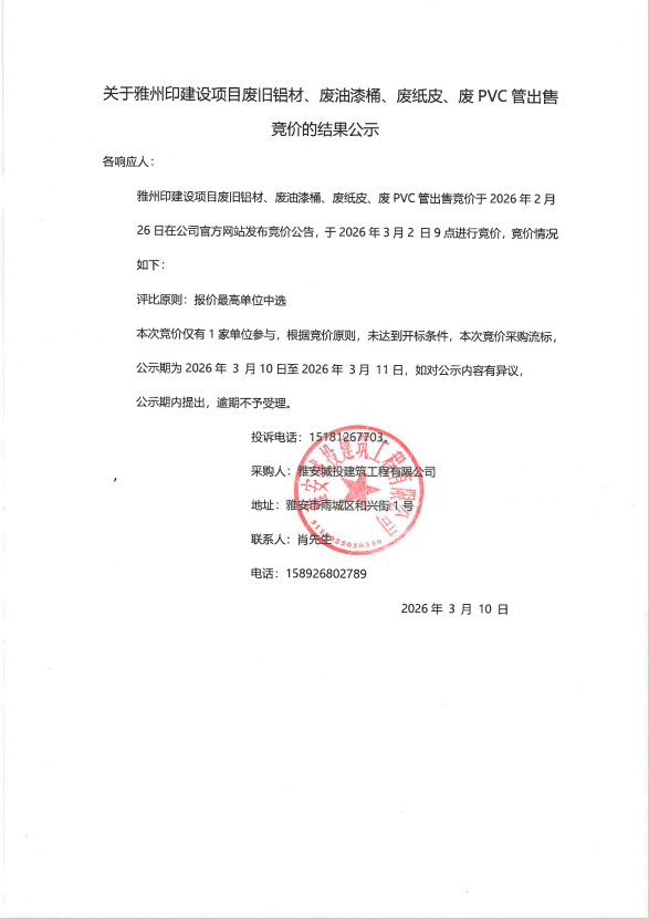 關(guān)于雅州印建設(shè)項目廢舊鋁材、廢油漆桶、廢紙皮、廢PVC管出售競價的結(jié)果公示