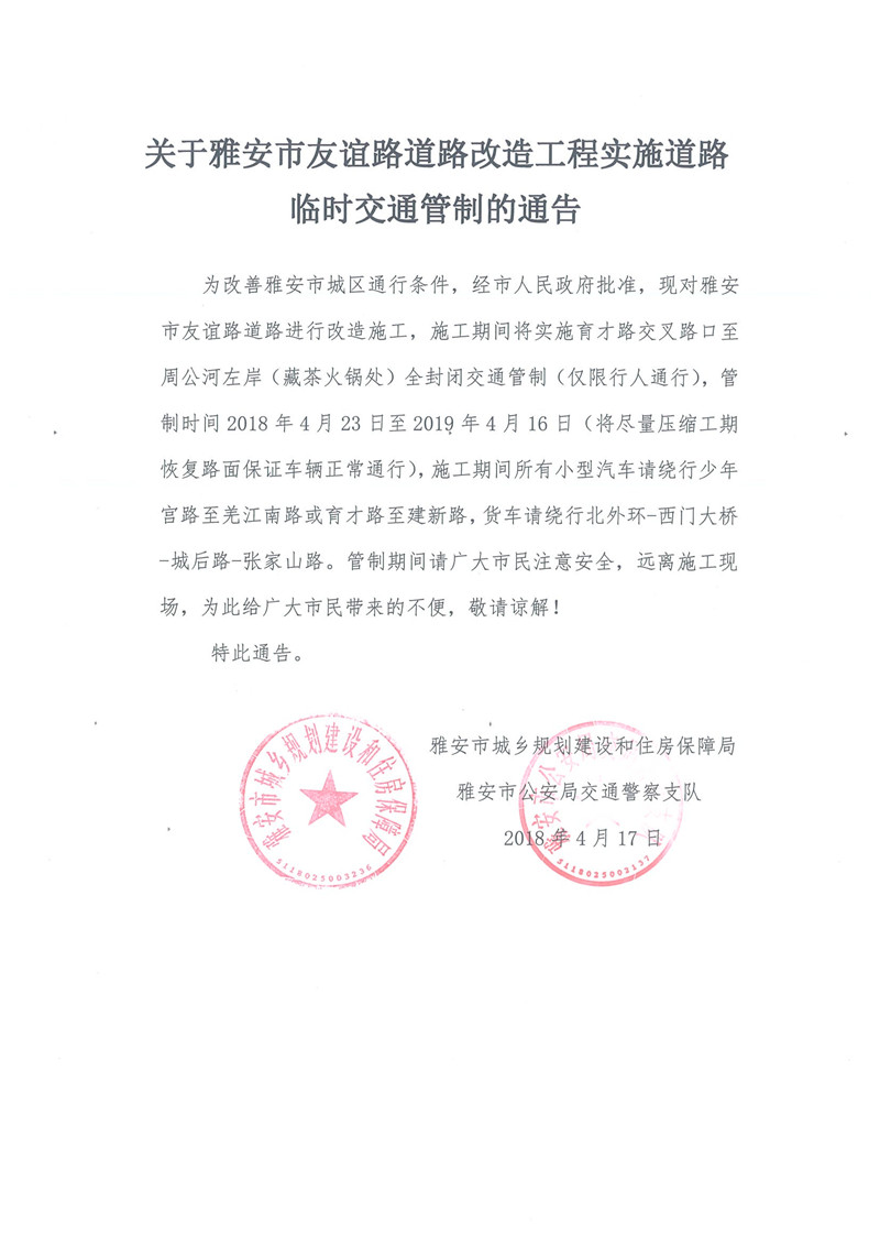 關于雅安市友誼路道路改造工程實施道路臨時交通管制的通告