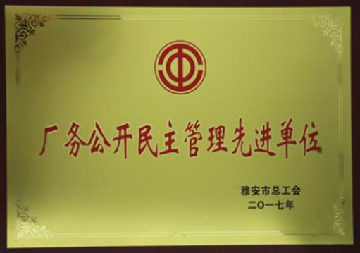2017年7月 我公司被評(píng)為“全市廠務(wù)公開民主管理先進(jìn)單位”