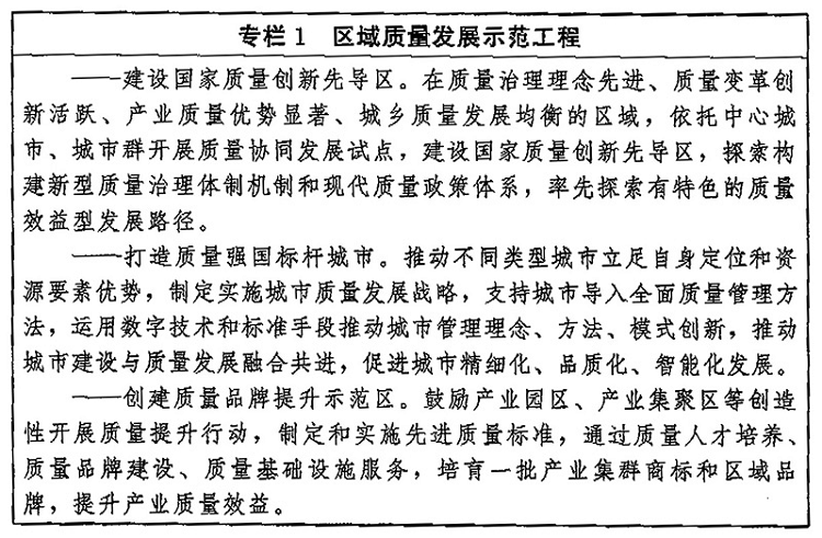 (九)打造區(qū)域質(zhì)量發(fā)展新優(yōu)勢(shì)。加強(qiáng)質(zhì)量政策引導(dǎo),推動(dòng)區(qū)域質(zhì)量發(fā)展與生產(chǎn)力布局、區(qū)位優(yōu)勢(shì)、環(huán)境承載能力及社會(huì)發(fā)展需求對(duì)接融合。推動(dòng)?xùn)|部地區(qū)發(fā)揮質(zhì)量變革創(chuàng)新的引領(lǐng)帶動(dòng)作用,增強(qiáng)質(zhì)量競(jìng)爭(zhēng)新優(yōu)勢(shì),實(shí)現(xiàn)整體質(zhì)量提升。引導(dǎo)中西部地區(qū)因地制宜發(fā)展特色產(chǎn)業(yè),促進(jìn)區(qū)域內(nèi)支柱產(chǎn)業(yè)質(zhì)量升級(jí),培育形成質(zhì)量發(fā)展比較優(yōu)勢(shì)。推動(dòng)?xùn)|北地區(qū)優(yōu)化質(zhì)量發(fā)展環(huán)境,加快新舊動(dòng)能轉(zhuǎn)換,促進(jìn)產(chǎn)業(yè)改造升級(jí)和質(zhì)量振興。健全區(qū)域質(zhì)量合作互助機(jī)制,推動(dòng)區(qū)域質(zhì)量協(xié)同發(fā)展。深化質(zhì)量強(qiáng)省建設(shè),推動(dòng)質(zhì)量強(qiáng)市、質(zhì)量強(qiáng)業(yè)向縱深發(fā)展,打造質(zhì)量強(qiáng)國建設(shè)標(biāo)桿。